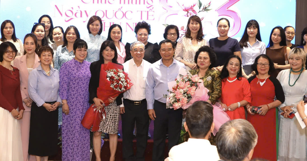 Chủ tịch UBND TP HCM Nguyễn Văn Được tặng hoa và chụp hình cùng các nữ doanh nhân ngày 8-3
