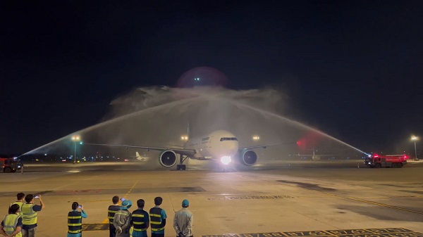 Nghi thức vòi rồng chào đón máy bay Turkmenistan Airlines lần đầu hạ cánh tại Tân Sơn Nhất. Ảnh: Turkmenistan Airlines