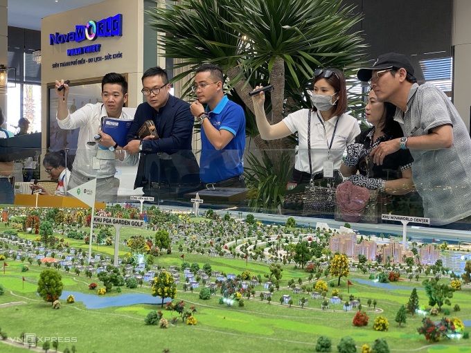 Khách hàng đang được nhân viên môi giới tư vấn dự án bất động sản nghỉ dưỡng của Novaland tại Phan Thiết (Bình Thuận), tháng 4/2021. Ảnh: Tất Đạt