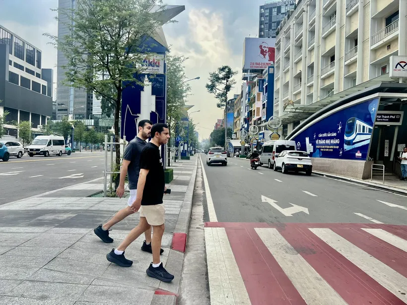 Du khách quốc tế dạo chơi trên đường Lê Lợi.